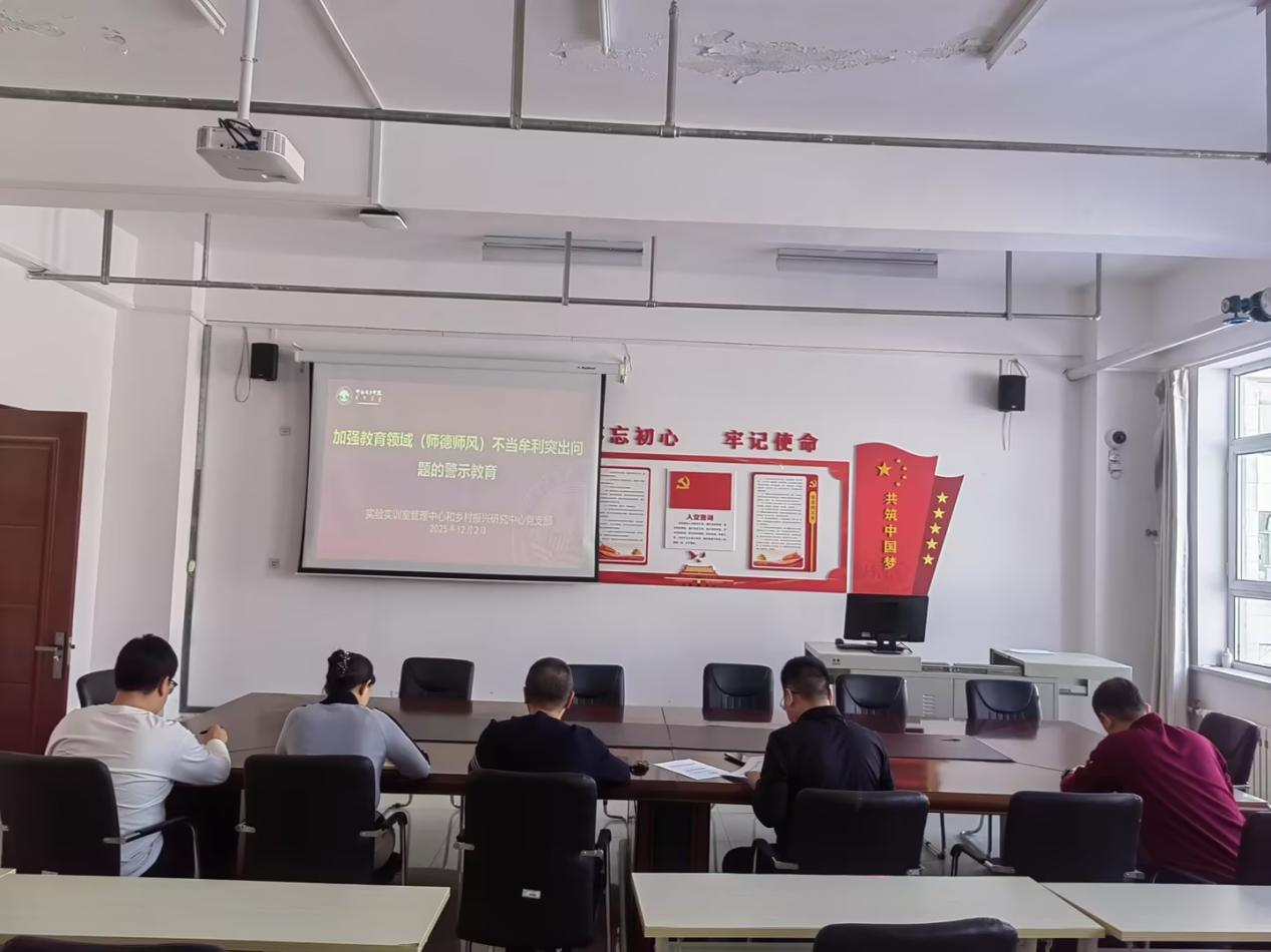 12月2日,实验实训室管理中心与乡村振兴研究中心党支部组织全体党员,开展师德师风专题警示教育活动,集中观看“加强教育领域(师德师风)不当牟利突出问题”警示教育片,并专题学习教育部公开曝光的两批共14起违反教师职业行为十项准则典型案例,党支部书记张玉桩主持活动。